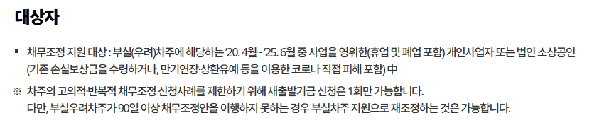 × 새출발기금 신청 유의사항 새출발기금 제도 안내 ’20. 4월~ ’25. 6월 중 사업을 영위한 개인사업자 또는 법인 소상공인이 보유한 금융권 대출에 대해 새출발기금 신청을 통해 상환기간은 늘려