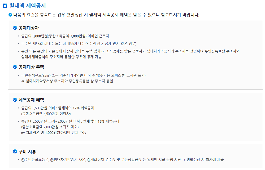 | 공제 한도 | 연간 월세 납입액 최대 1,000만 원까지 인정 |