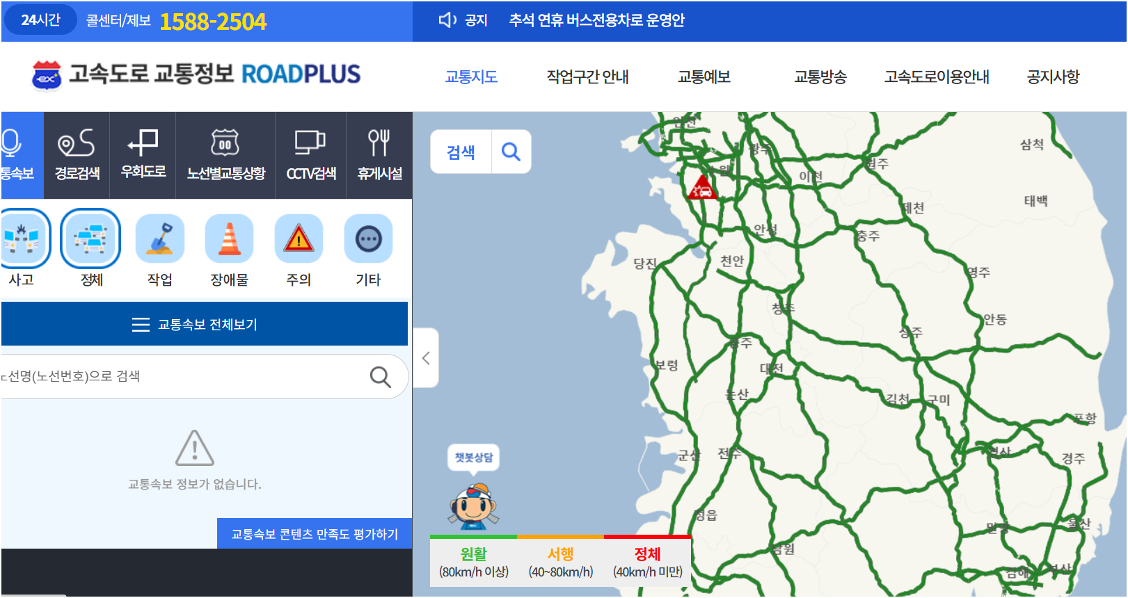 교통안전 홍보채널 --> 원활 (80km/h 이상) 서행 (40~80km/h) 정체 (40km/h 미만) 휴게소 휴게소 사고 사고 작업 작업 날씨 날씨 졸음쉼터 졸음쉼터 전면차단 전면차단 --> 홈페이지 콘텐츠 만족도(교통지
